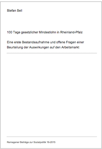 Sell, S.: 100 Tage gesetzlicher Mindestlohn in Rheinland-Pfalz. Eine erste Bestandsaufnahme und offene Fragen einer Beurteilung der Auswirkungen auf den Arbeitsmarkt. Remagener Beiträge zur Sozialpolitik 16-2015. Remagen 2015
