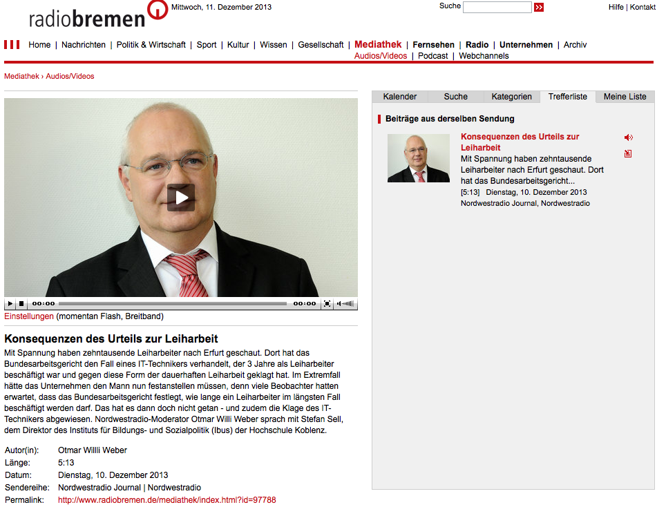 Interview zum Thema „Konsequenzen des Urteils zur Leiharbeit“ in der Sendung „Nordwestradio Journal“ (Radio Bremen/NDR) am 10.12.2013, 17:30 Uhr