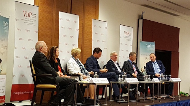 Podiumsdiskussion auf dem Bundeskongress des Verbandes Deutscher Privatschulverbände (VDP) mit Dr. Barbara Dorn, Bundesvereinigung der deutschen Arbeitgeberverbände (BDA), Kornelia Haugg, Bundesministerium für Bildung und Forschung, Prof. Dr. Michael Meister, Bundesinstitut für Berufsbildung (BIBB), Dietmar Schlömp, Bundesgeschäftsführer VDP, Prof. Dr. Stefan Sell, Institut für Sozialpolitik und Arbeitsmarktforschung der Hochschule Koblenz (ISAM) und Friedhelm Siepe, Geschäftsführer Integration und Fördern, Bundesagentur für Arbeit (BA)